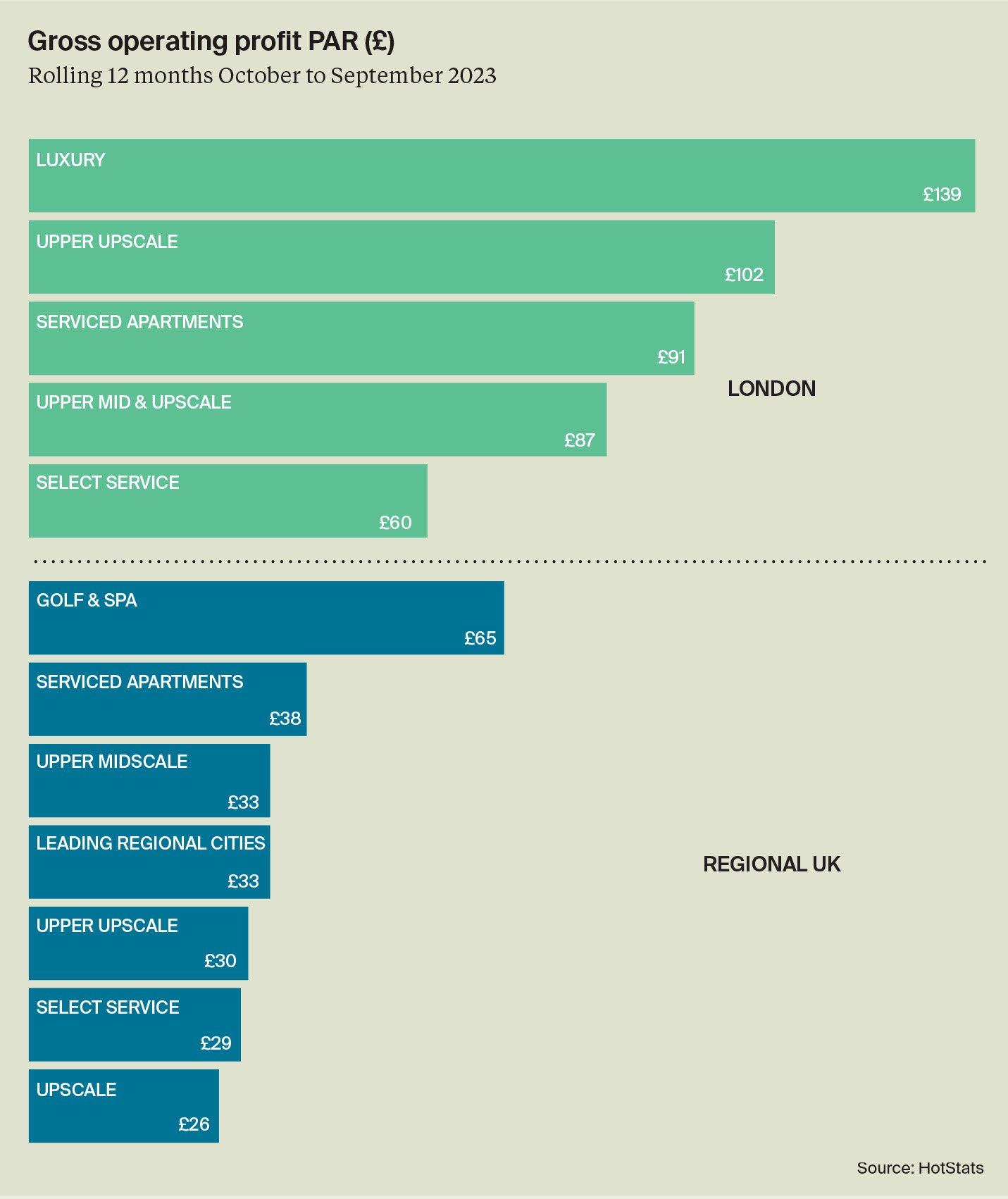 Across Regional UK over the same period, total costs PAR increased at a faster pace than TRevPAR growth, with costs rising by 17%. Despite the GOP margin falling by 1.5 basis points to 29.1%, respectable GOPPAR growth of 9% was achieved, rising to over £34. GOPPAR performance is now 5.1% ahead of 2019 profits.