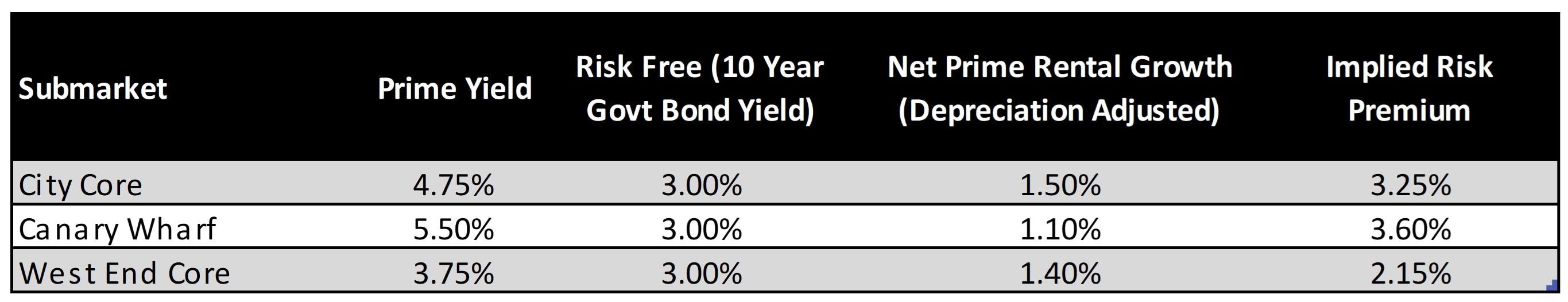 Breaking down pricing fundamentals into its component parts shows the implied risk premium is highest in Canary Wharf at 3.60% followed by 3.25% in the City Core and 2.15% in the West End Core.
