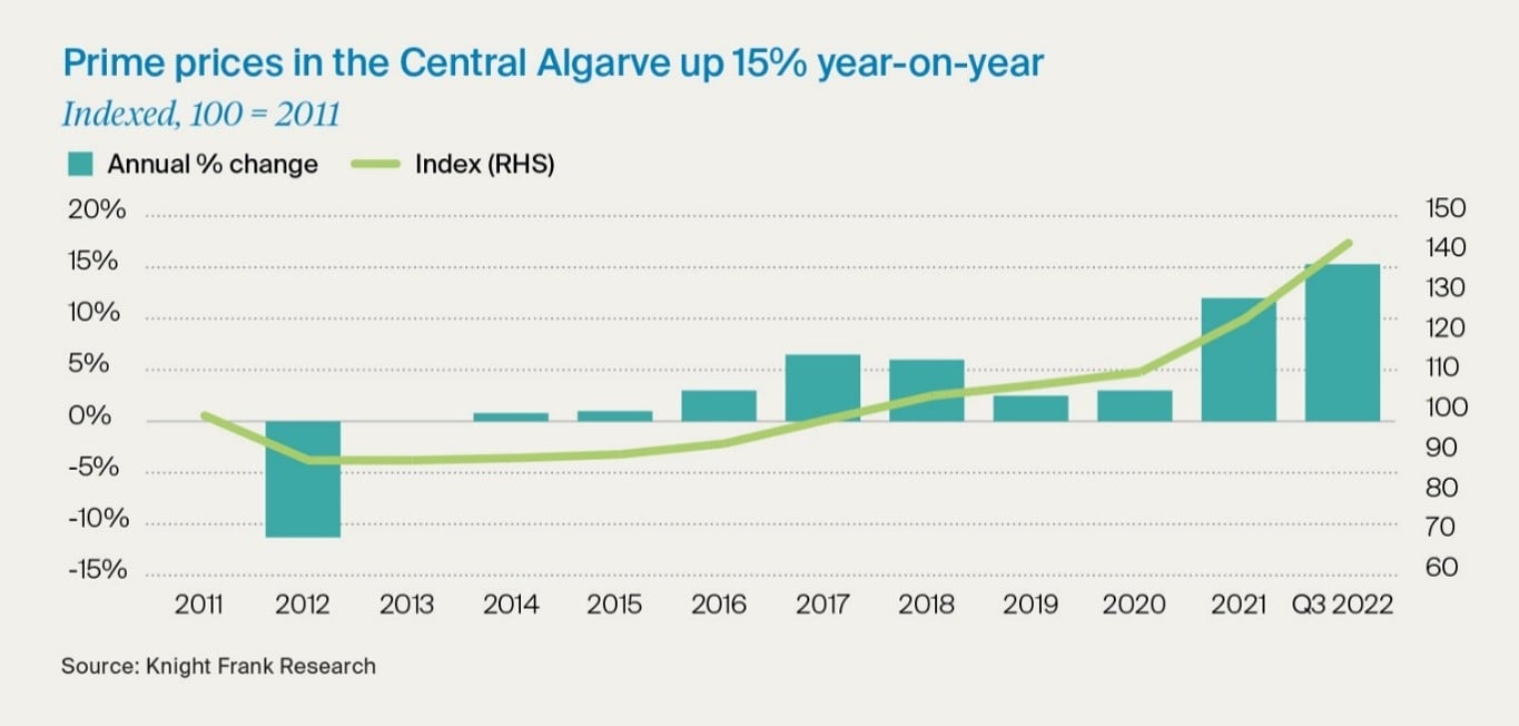 Prime prices in the golden triangle of the Central Algarve, which stretches from Almancil at the top of Quinta do Lago and along the coast to Vilamoura, increased 15% in the 12 months to September 2022.