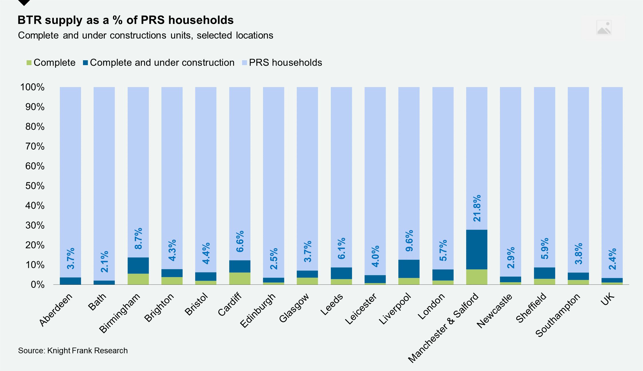 With supply falling, the need for further investment and development from institutional landlords into the growing Build to Rent sector is stronger than ever. 2022 marked a third consecutive record year for investment in the UK – we tracked £4.33 billion worth of deals. Accordingly, the development pipeline is growing, but it remains a small proportion of the overall private rental market (see chart). You can read our thoughts on the future of the sector here.