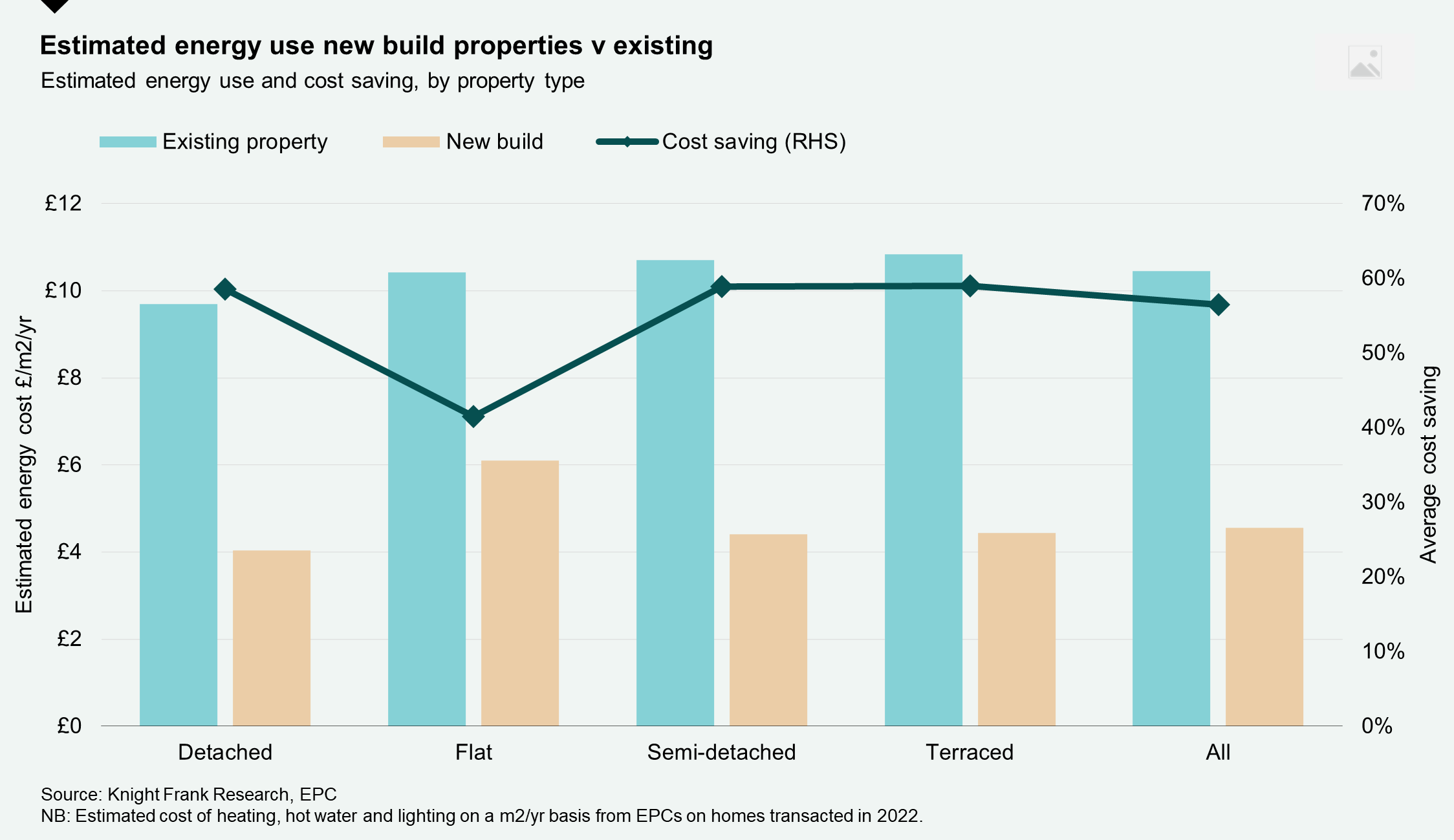 The numbers are compelling. Our analysis of EPC data from more than 600,000 new and existing properties transacted over the last three years points to an average 56% saving on annual energy costs (lighting, heating and hot water) when comparing a new-build with an existing property.