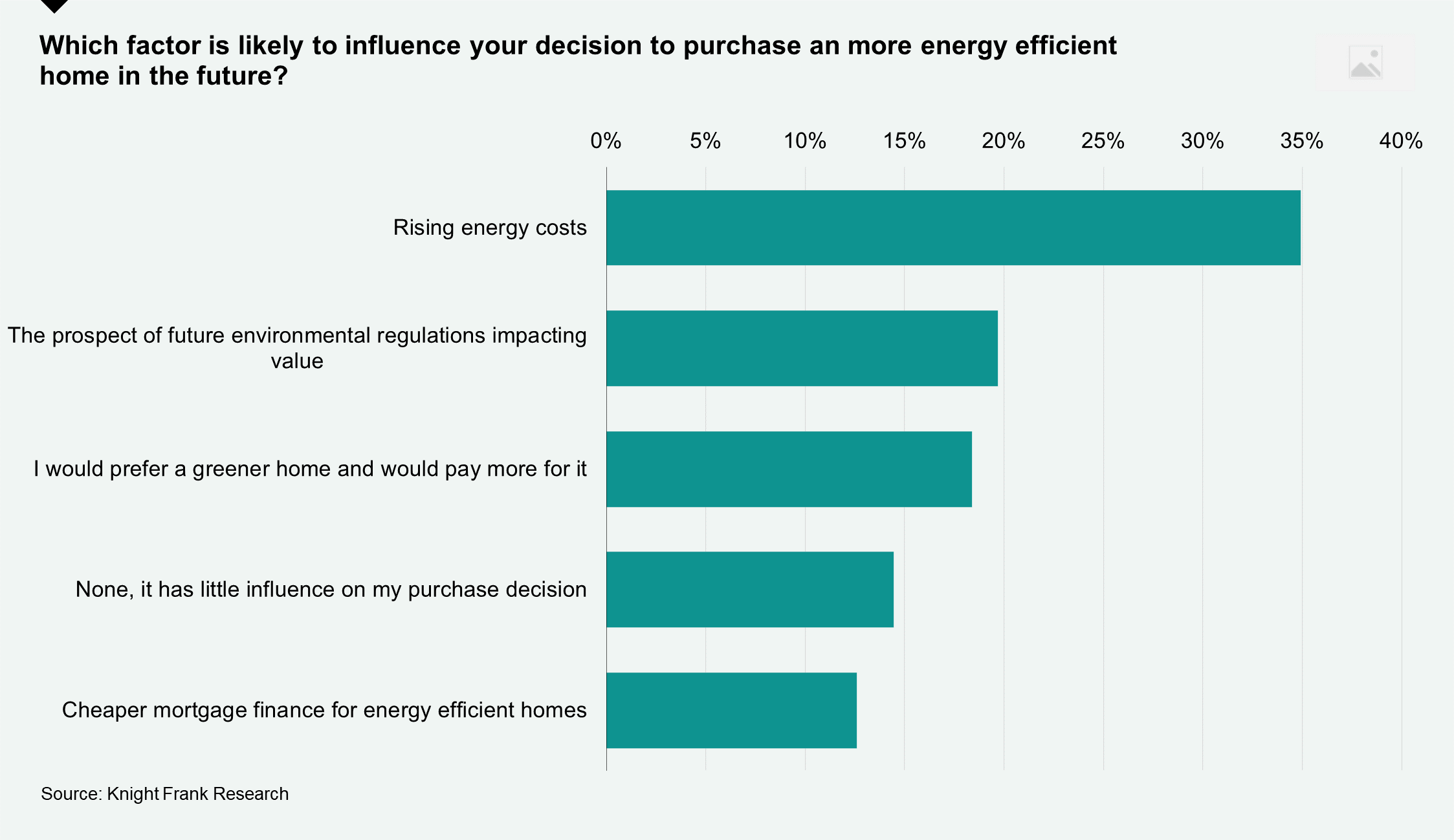 Our own housing market sentiment survey confirms that higher energy costs are the key driver for those looking to move to a more energy efficient home. More than a third of our survey respondents cited rising energy costs as the key factor, while 20% cited the spectre of future environmental regulations affecting the value of inefficient homes.