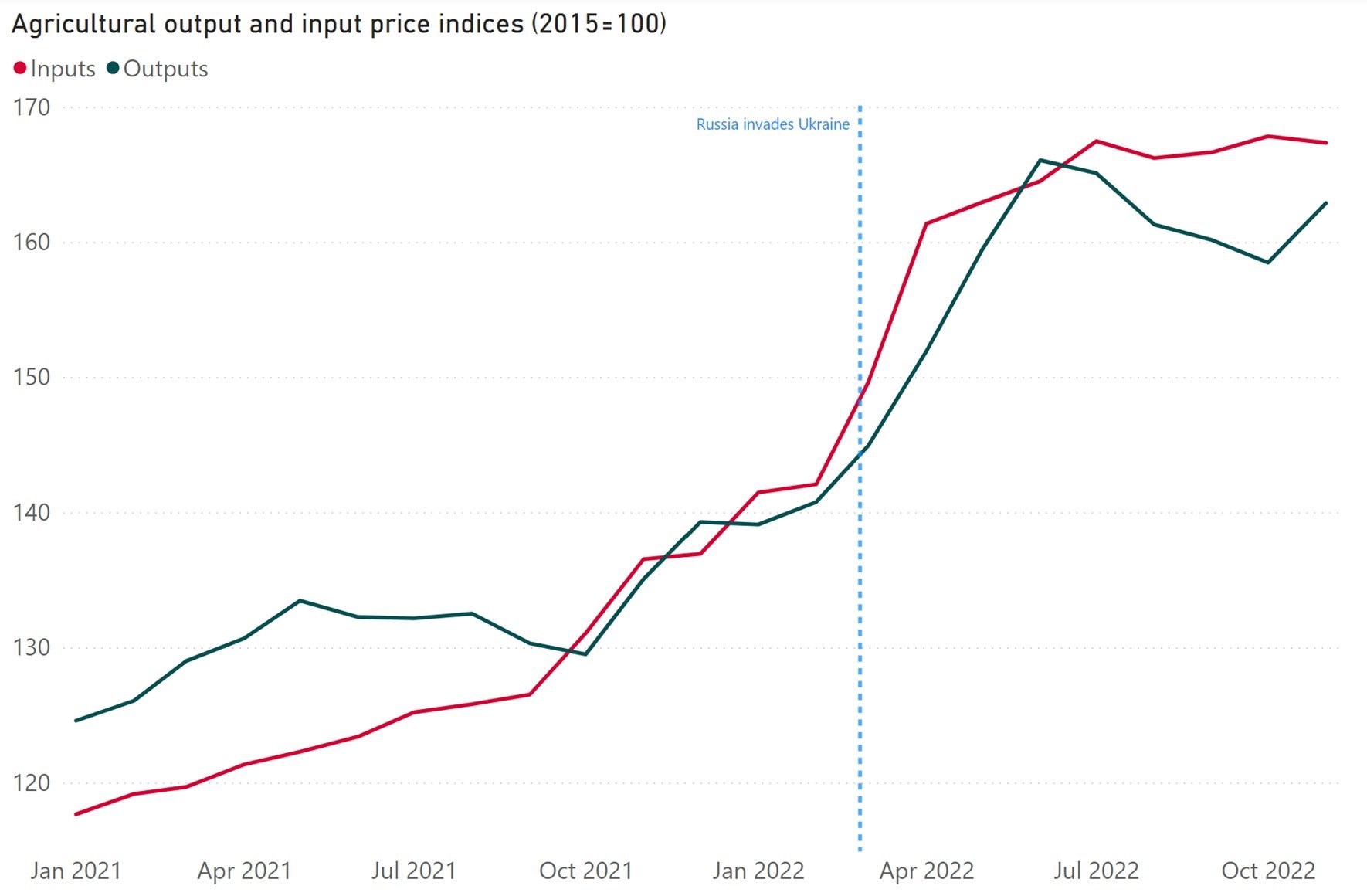 In the 12 months after the war started, both agricultural input and output prices rose sharply but then took slightly different paths – with output prices easing back but input prices essentially remaining high.