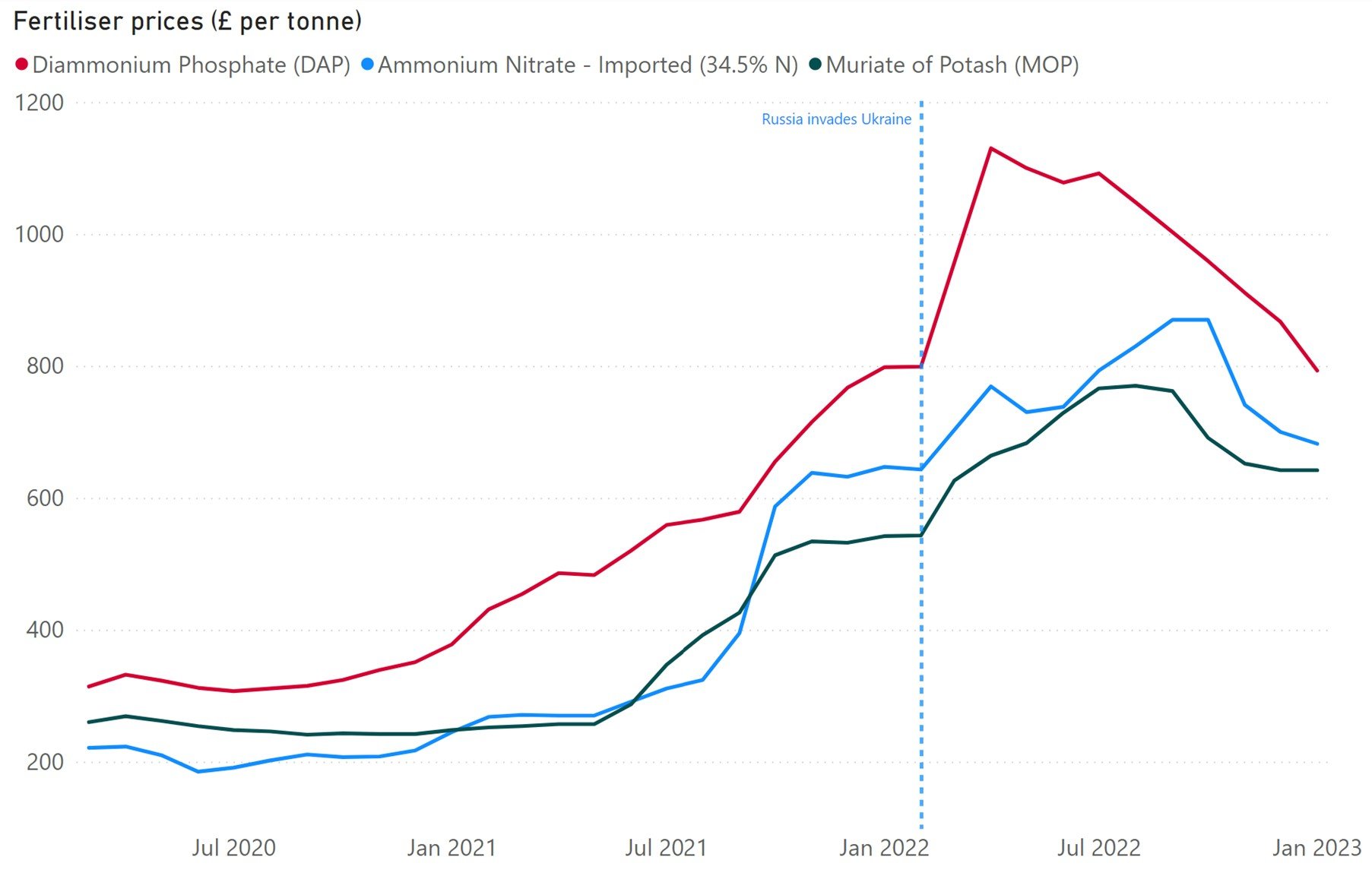 In February 2022, ammonium nitrate (AN) prices were already at a historical high of, on average, £650 per tonne for imported products. Six months into the war imported AN reached £870 per tonne. This increase was greater than the price that AN fertiliser was selling, on average, in spring 2020. Prices have eased back to somewhere approaching pre-war values but remain stubbornly high.