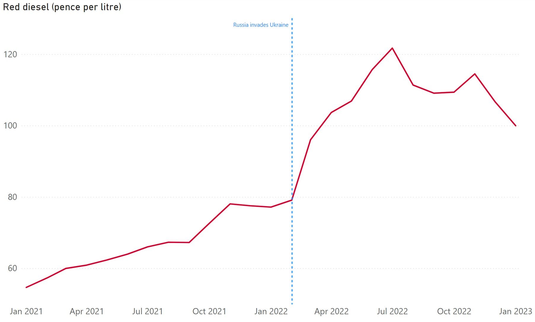 Red diesel had already climbed to nearly 80p per litre, including fuel duty, at the start of the war. But this surged to over 120p per litre by July 2022. Some rural businesses even received quotes higher than this and were contemplating buying white diesel and claiming back the VAT.
