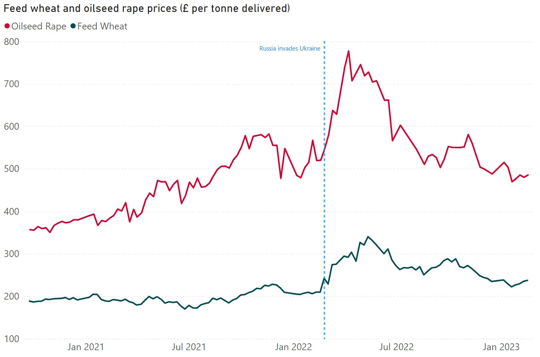 Feed wheat prices soared from £206 per tonne to £340 in the first ten weeks of the war before pegging back to £237 per tonne (23 February 2023).