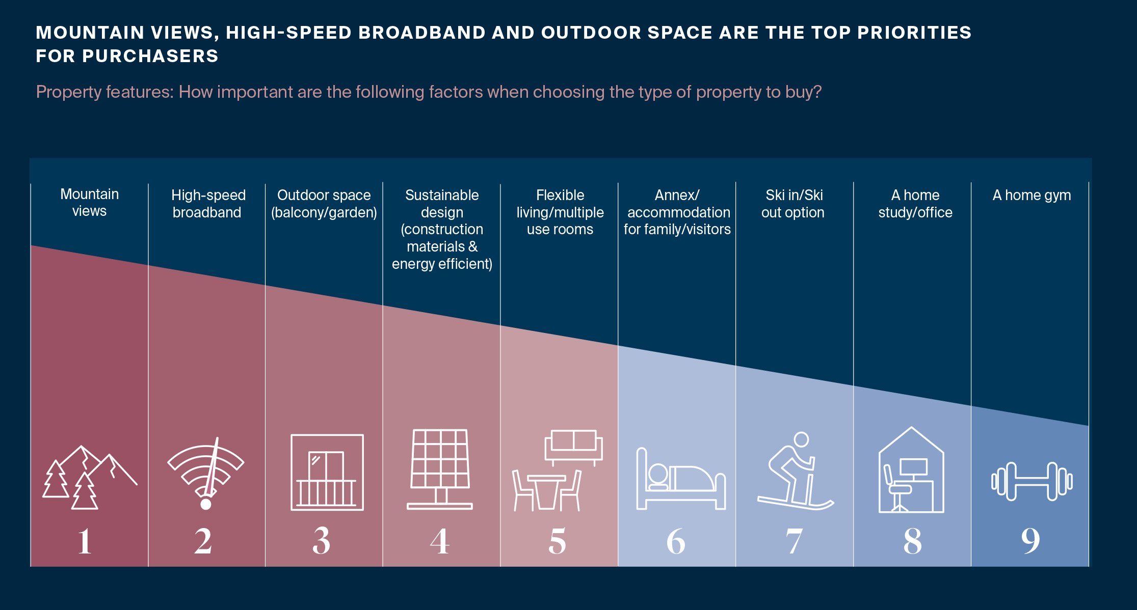 Mountain views, high-speed broadband and outdoor space, are the top priorities for purchasers, all of which have grown in demand since the pandemic.