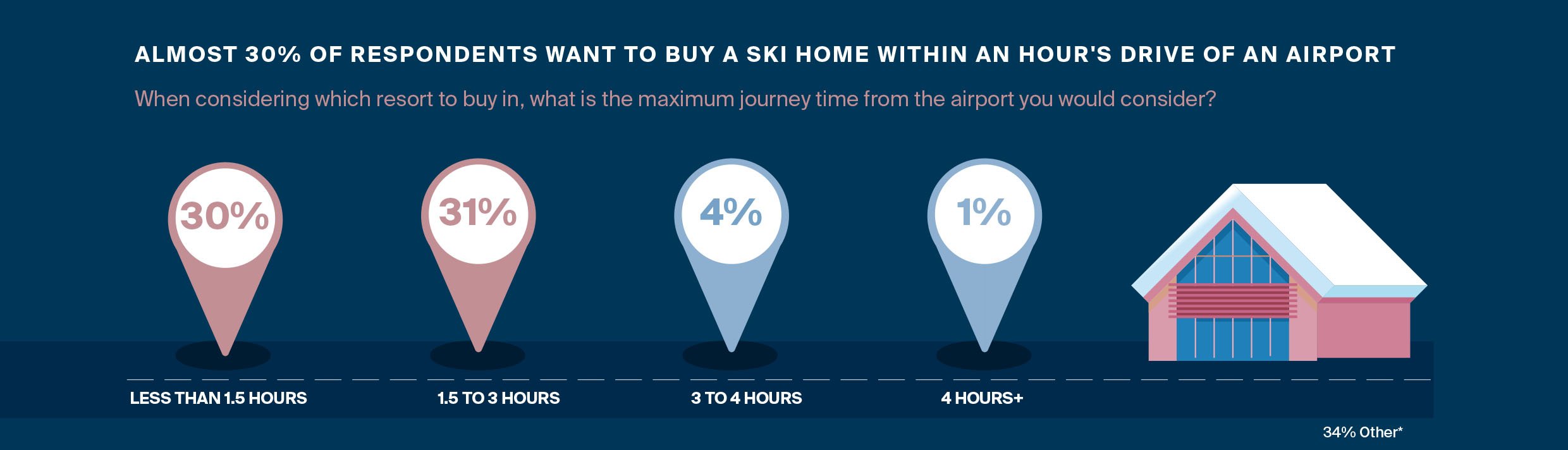 The distance from an airport is also important. Some 30% of buyers want to travel less than 1.5 hours from the airport, outlining the demand for easy access to the slopes.