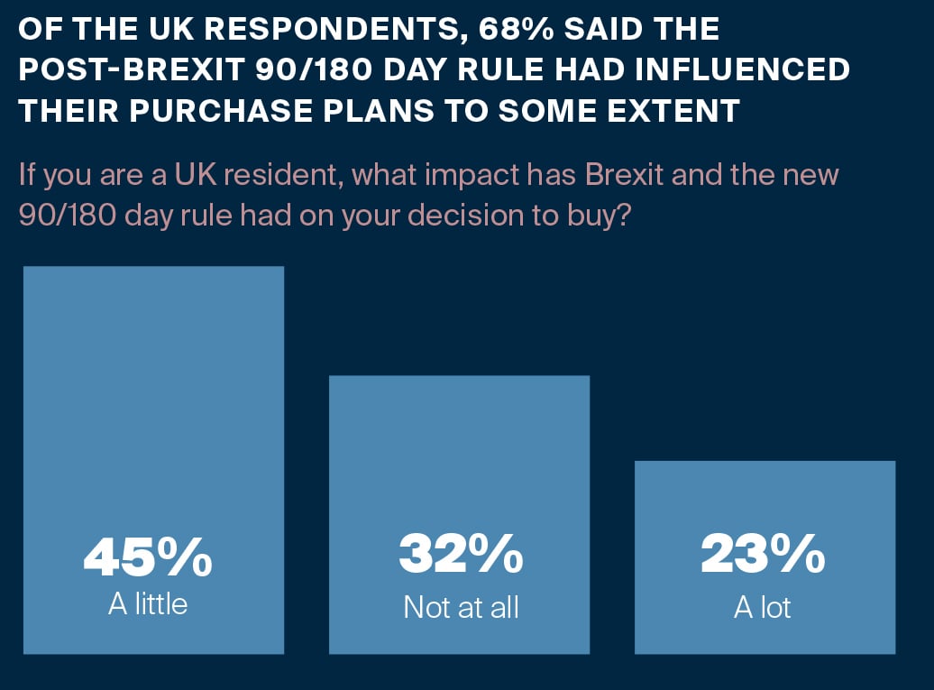 Since the UK’s departure from the European Union, UK buyers have been limited to a stay of 90 days out of every 180. However, asked whether the rule had any impact on their decision to buy, 32% of respondents said had made no difference at all when considering a ski home purchase, 45% stated it had made a little difference, only 23% commented it had made a big difference.