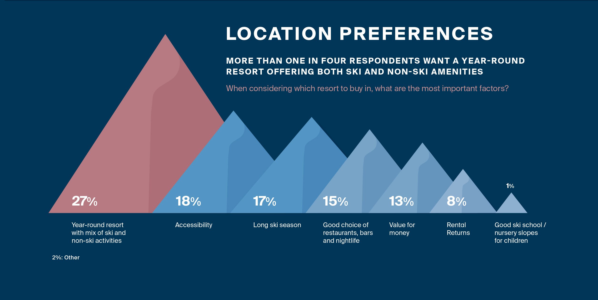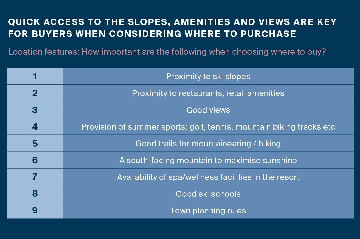 Proximity to ski slopes and general amenities lead the rankings when buyers were asked what is most important to them when purchasing a ski home, with the provision of summer sports and good mountaineering trails being notably important too.
