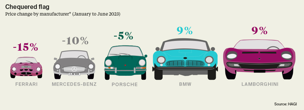 According to the HAGI Top Index, prices dropped by almost 7% in the first half of the year. Ferrari experienced the most significant decline, falling slightly more than 15%.