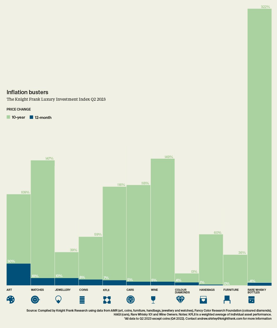 The Knight Frank Luxury Investment Index (KFLII), which tracks a weighted basket of 10 collectibles, rose by 7% in the 12 months to the end of June 2023.