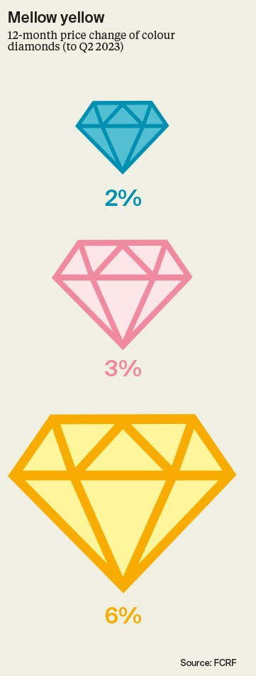 Although pink diamonds have seen the strongest price growth over the long term, yellow diamonds have been rising in popularity over the past 12 months, according to the latest FCRF data.