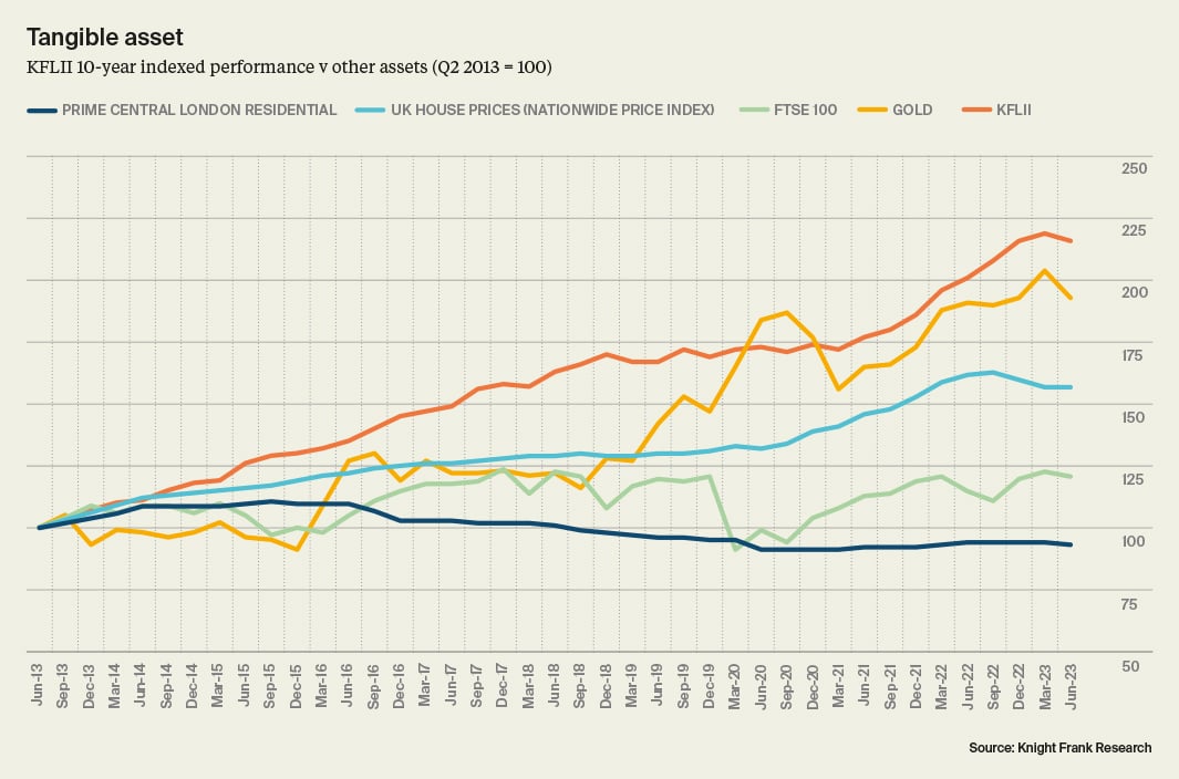 This was a creditable performance compared with houses in Prime Central London, down 1% over the same period; the FTSE 100 index of equities, which rose by 5%; and gold which was up in value by just 1%. But it was the weakest annual performance by KFLII since Q2 2021, proving that even tangible assets are not immune to market uncertainty.