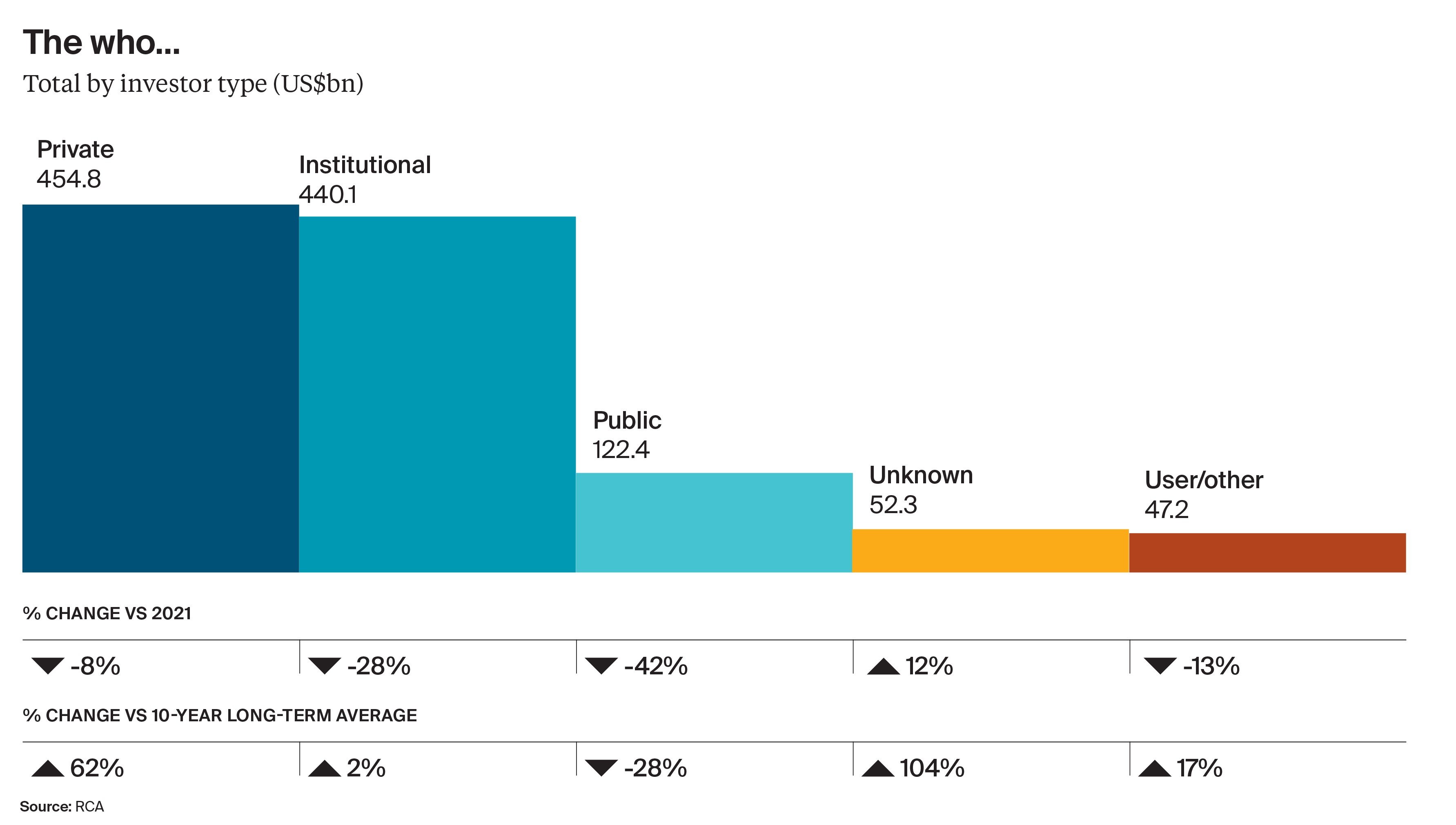 Despite the global macroeconomic and geopolitical headwinds that persisted throughout 2022, investment from private sources remained robust. Private investors were the most active buyers in global commercial real estate markets in 2022 with US$455 billion invested, accounting for 41% of the total, according to RCA.