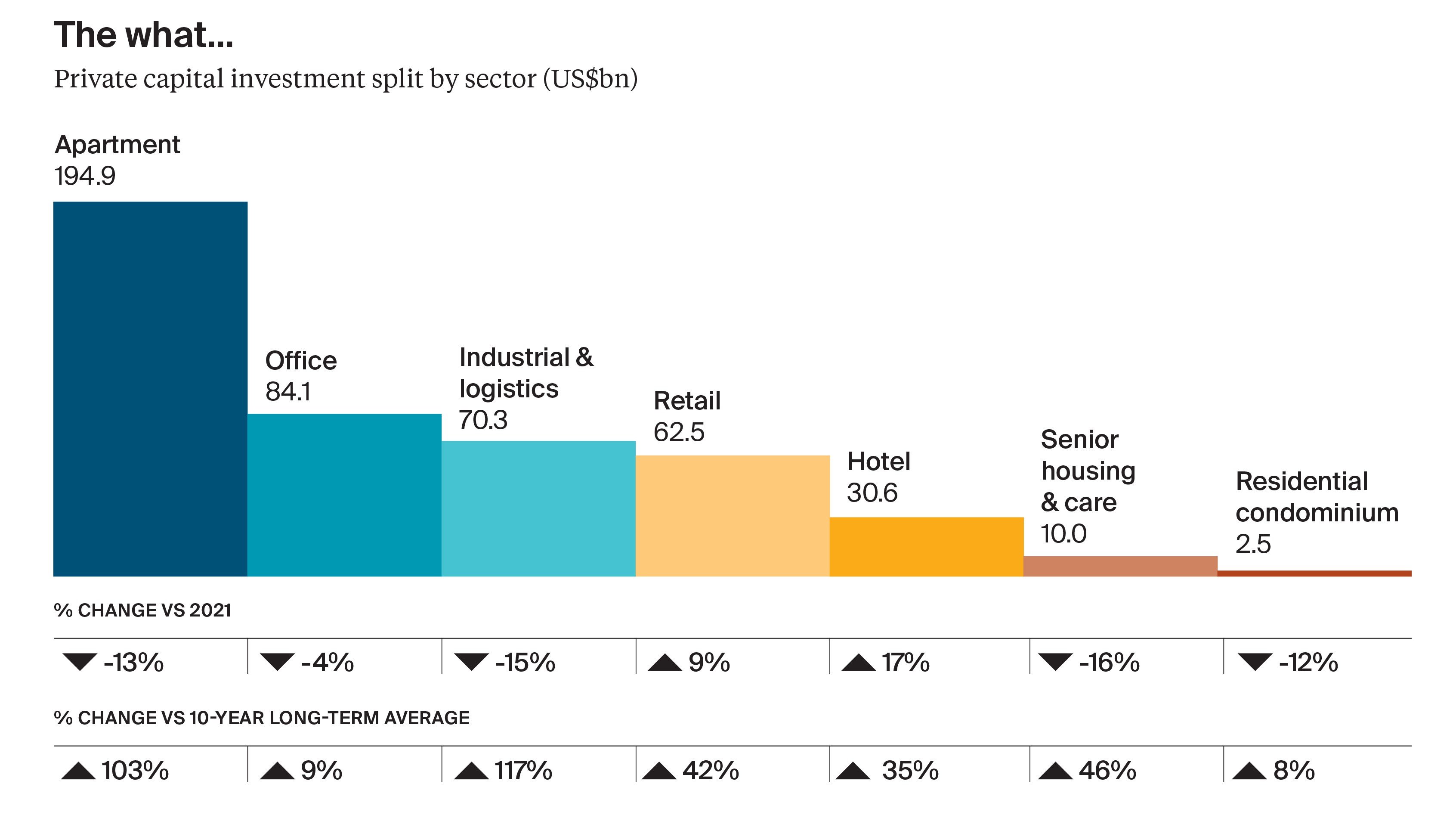 This represents private buyers’ highest share of global commercial real estate investment on record. It’s also the first time private investment has surpassed institutional investment. Institutions invested a total of US$440 billion in 2022, 28% below 2021 volumes, but 2% above the 10-year average.