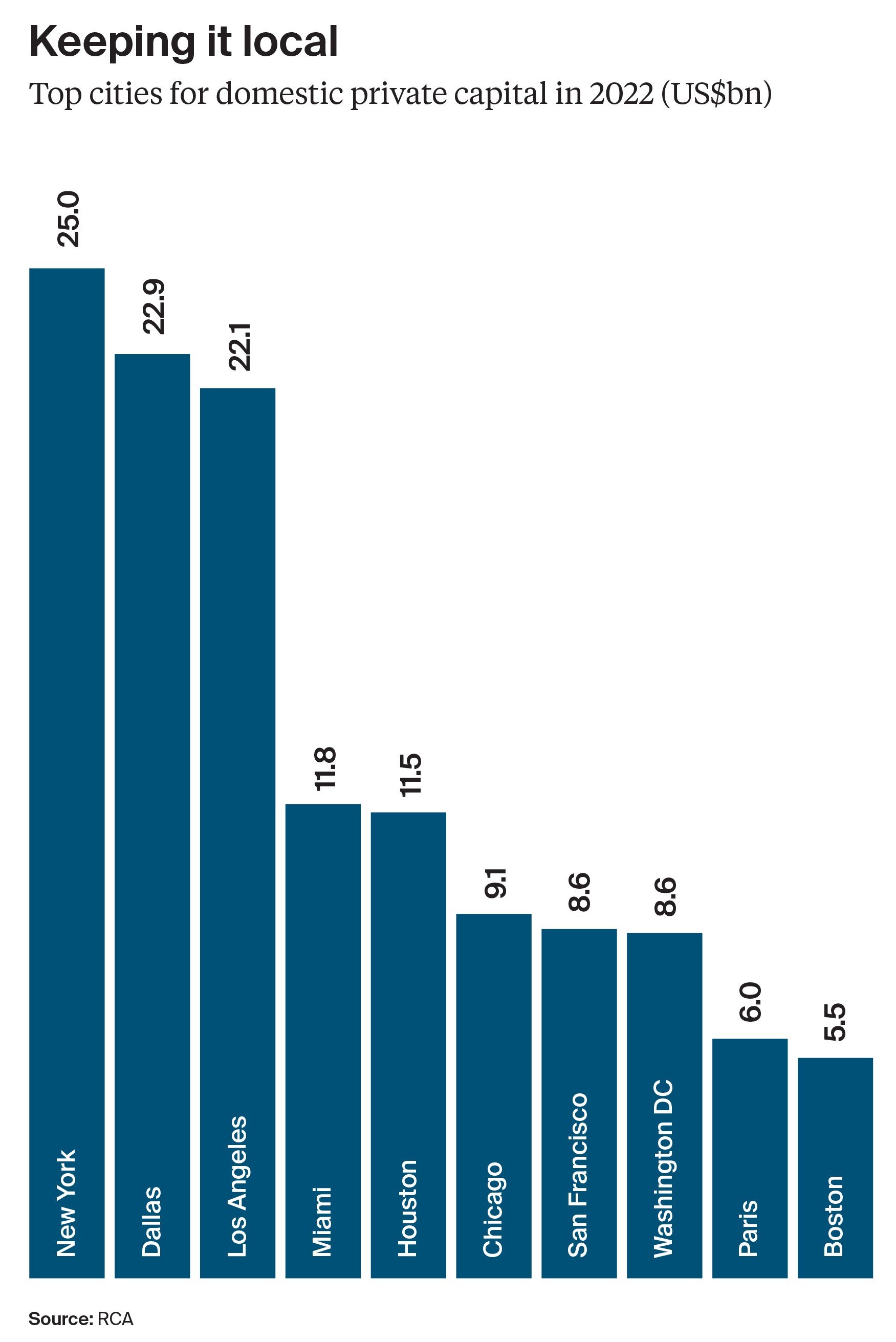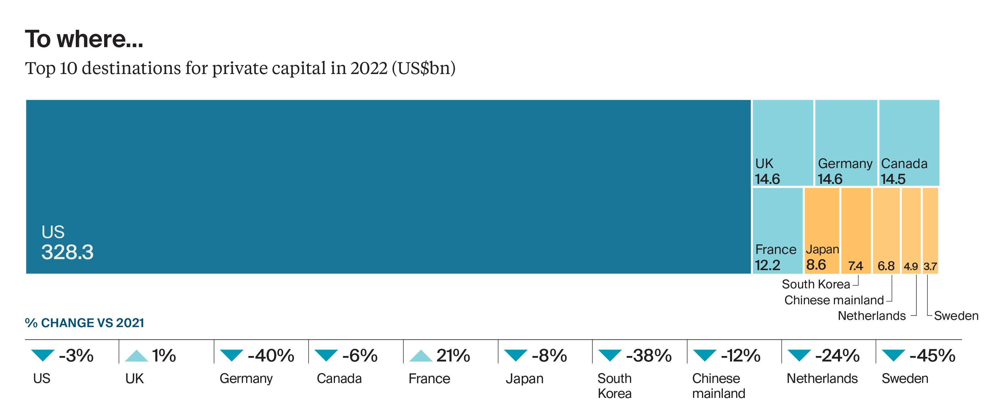 Of the top 10 sources of private capital last year, investors from France and the Chinese mainland were the only buyers to increase investment in 2022, up 27% and 25% on the previous year to US$13.8 billion and US$6.3 billion, respectively.