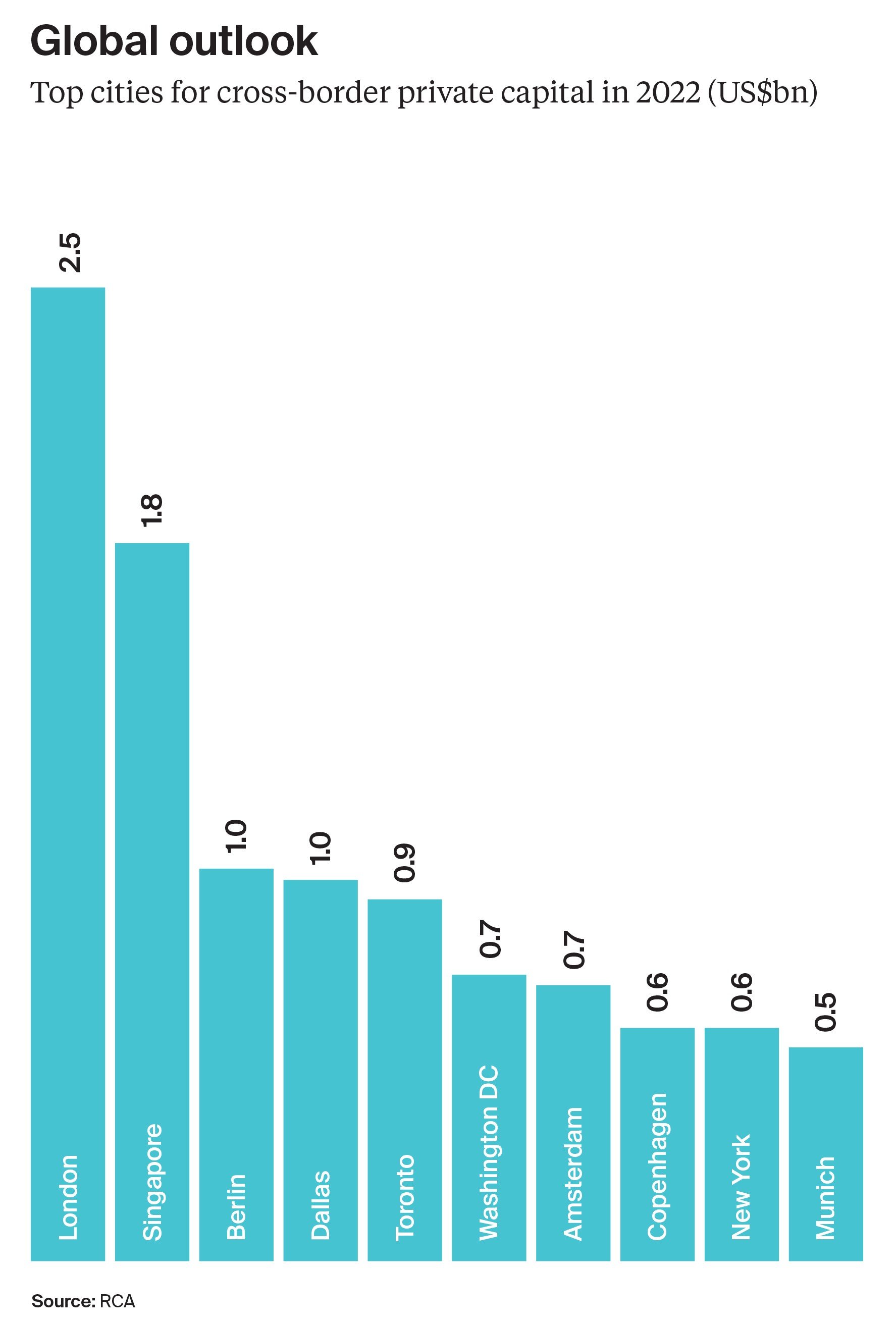 While eleventh overall for total private investment (cross-border and domestic) in 2022, London was top for cross-border private capital with US$2.5 billion. Overall, this accounted for 44% of the total private investment into the city and 15% of total global cross-border private investment into cities in 2022.