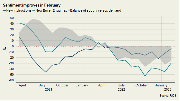 New buyer enquiries climbed from -45% last month to -29% in February. Net new listings were -4%, compared with -12% in January. The net balance score represents the difference between the number of respondents that saw an increase in the month and those that saw a decrease.