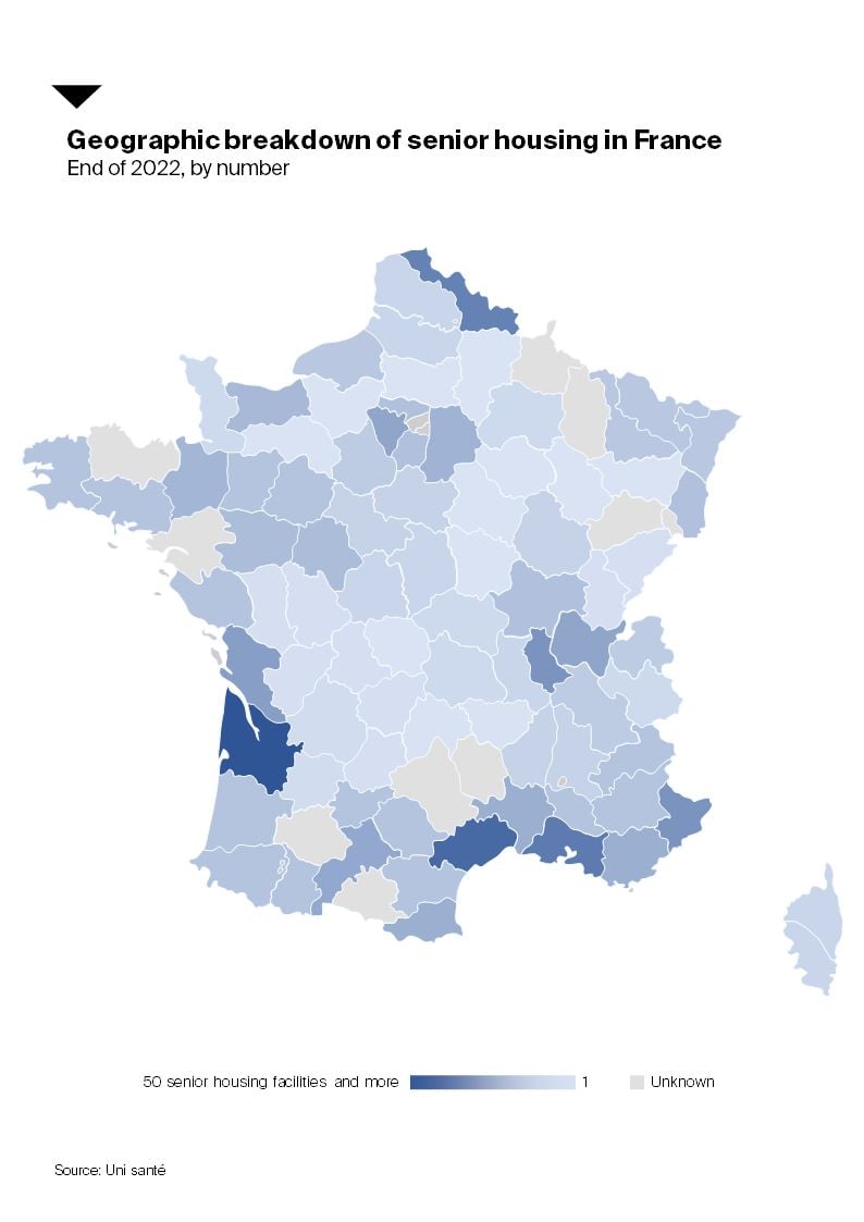 Unevenly distributed throughout France, the stock is concentrated in coastal areas, usually favoured by the elderly population, as well as in dense and dynamic urban areas, mainly in city centres for reasons of accessibility, socialisation and proximity to services. Supply is particularly well developed in the regions of New Aquitaine (especially in Gironde and Charente-Maritime), Provence-Alpes-Côte d'Azur (in the departments bordering the Mediterranean) and Brittany. There are also many establishments in the Paris region and close to regional cities such as Lille and Lyon.