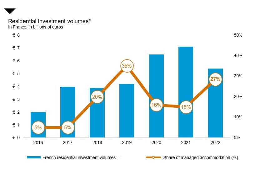 In 2022, the managed residential market totalled €1.4 billion, an increase of almost 40% compared to 2021 and 27% of the total amount invested in the French residential market.