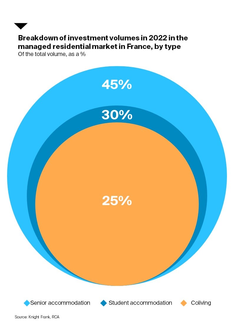 This result can be explained in particular by investors' appetite for senior housing, with some thirty transactions totalling €650 million, of which just over half was in the Greater Paris Region and almost two thirds in the form of forward-funding sales. Forward-funding sales also dominate the student accommodation market, which accounted for 30% of the sums committed in the managed residential sector in France in 2022, as well as the co-living market (20%).