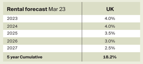 Along with expectations for relatively robust wage growth in the near term, this supports our expectation for cumulative rental growth of 18.2% across the UK over the next five years across the private rented sector.
