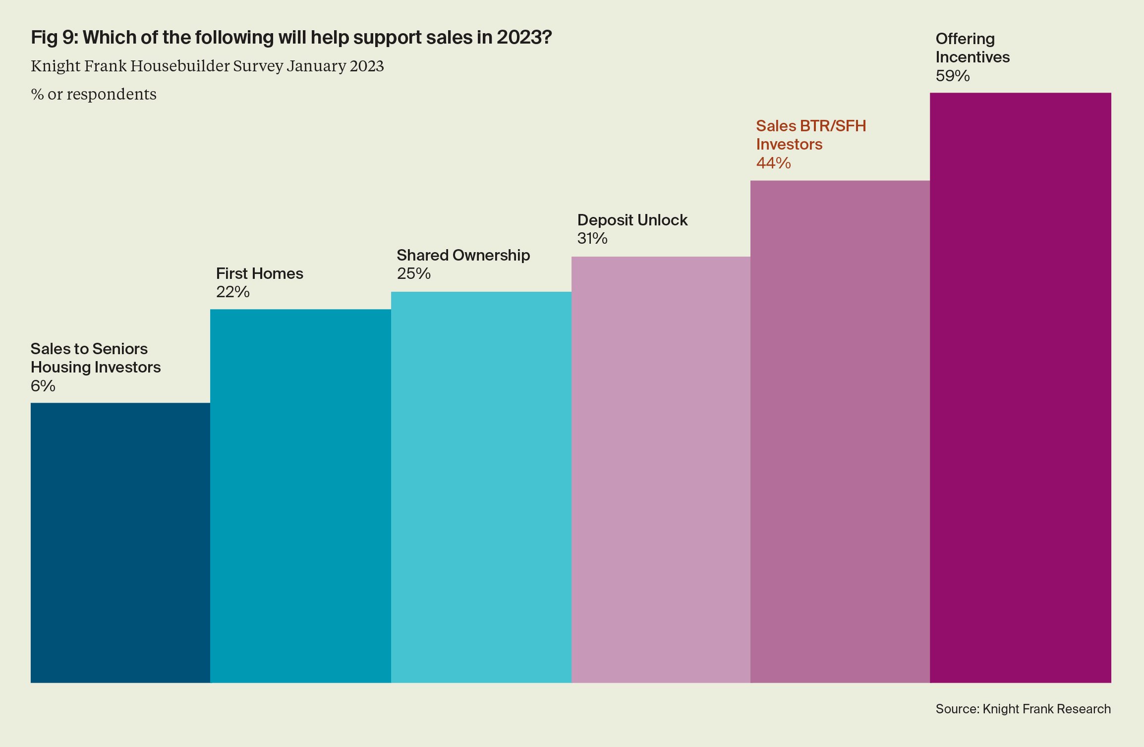 Our latest quarterly survey of volume and SME housebuilders supports this view, with 44% of survey respondents stating that sales to BTR investors (of both apartments and houses) will play a greater role in the market this year, up from 17% in Q2 2022. Consequently, we expect to see more partnership agreements and bulk sales between housebuilders and SFH investors as they look for new exit routes.