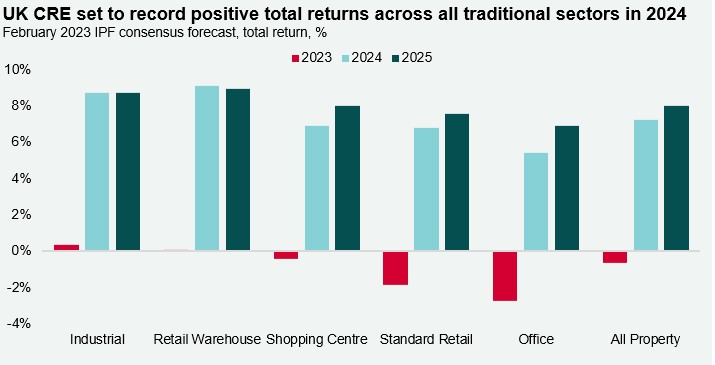 The latest IPF Consensus forecast outlined improved commercial property forecasts in 2023 and 2024, in line with wider improvements to the UK economic outlook. All UK Property total return projections for 2023 increased by 175bps to -0.6% in February, with total return forecasts revised higher across all sectors. This was driven by an uplift to the capital value outlook. All Property capital values are expected to decline by -5.5% this year, compared to a -7.7% decline last forecast in November. Despite a more positive outlook for 2023, Industrial is the only sector expected to deliver a positive total return at 0.4%. Between 2023-2027, both Industrial and Retail Warehouses are expected to outperform with a total return of 6.5% per annum, followed by Shopping Centres (5.7% p.a), Standard Retail (5.0%) and Offices (4.4%).