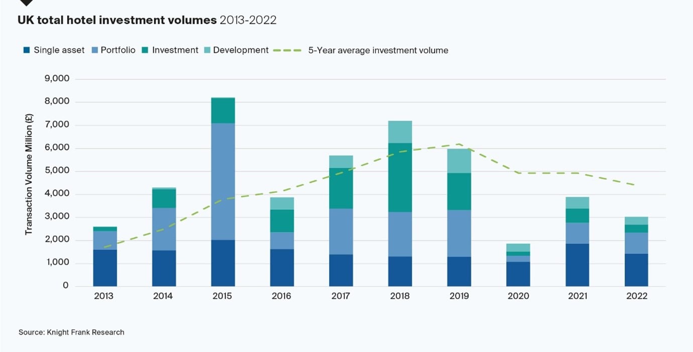 £3 billion of UK hotel investment in 2022 was 31% below the five-year average and 22% below the previous 12 months investment levels.