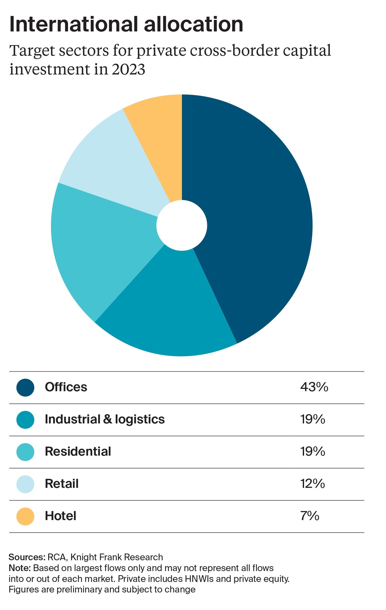 Offices will continue to dominate. More than 40% of total private cross-border capital is forecast to be targeted at the office sector, while industrial and residential are each expected to receive a 19% share.