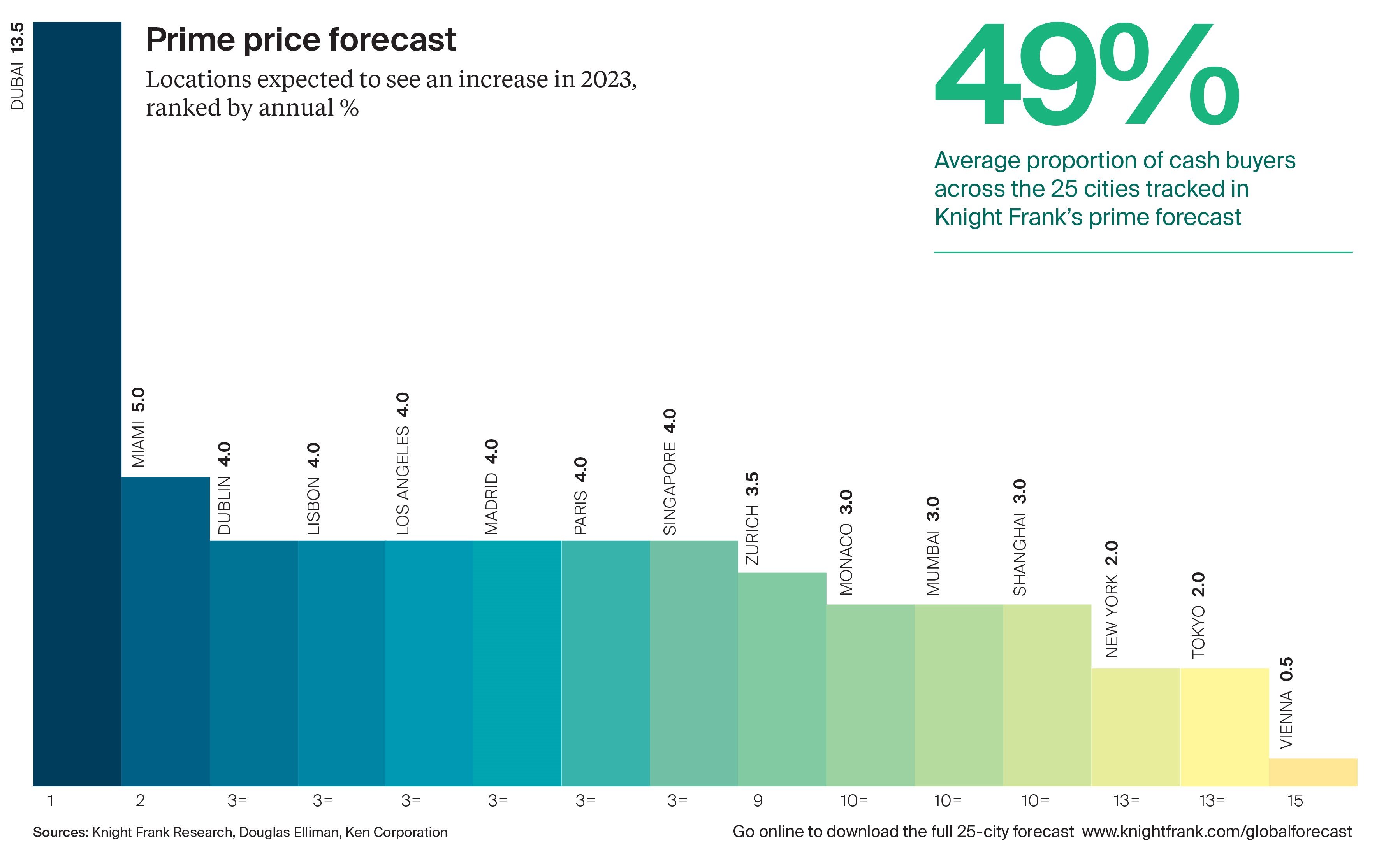 Dubai leads the forecast with prime prices forecast to climb 13.5% in 2023, its relative affordability, broadening global appeal and accessibility a key draw.