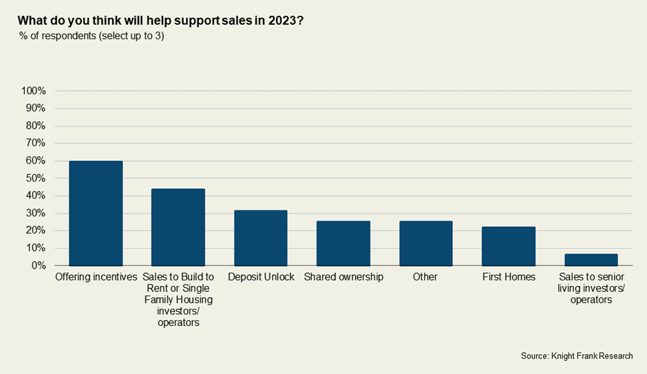 In the absence of sales supports such as Help to Buy, which officially closed to new applications in October, just under 60% of survey respondents said they expected offering incentives would help support sales volumes in 2023. A third said they were seeking partnerships or bulk sales deals with institutional investors in the Build to Rent sector this year.
