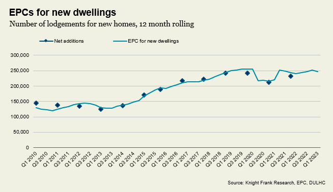 The number of Energy Performance Certificates allocated to new homes, a good leading indicator for housebuilding, fell 10% to 53,000 in Q1, according to official figures published yesterday.