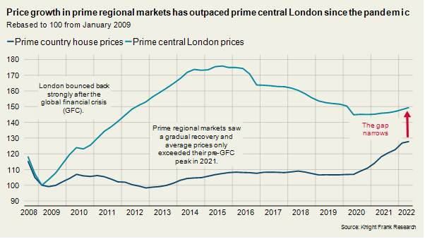 The price gap between the UK country house and prime central London (PCL) markets has narrowed by a fifth since the pandemic, according to Knight Frank data.