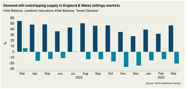 While key sales indicators remained subdued with new instructions and buyers both down, according to RICS, the letting market continues to see demand outstrip supply (see chart).