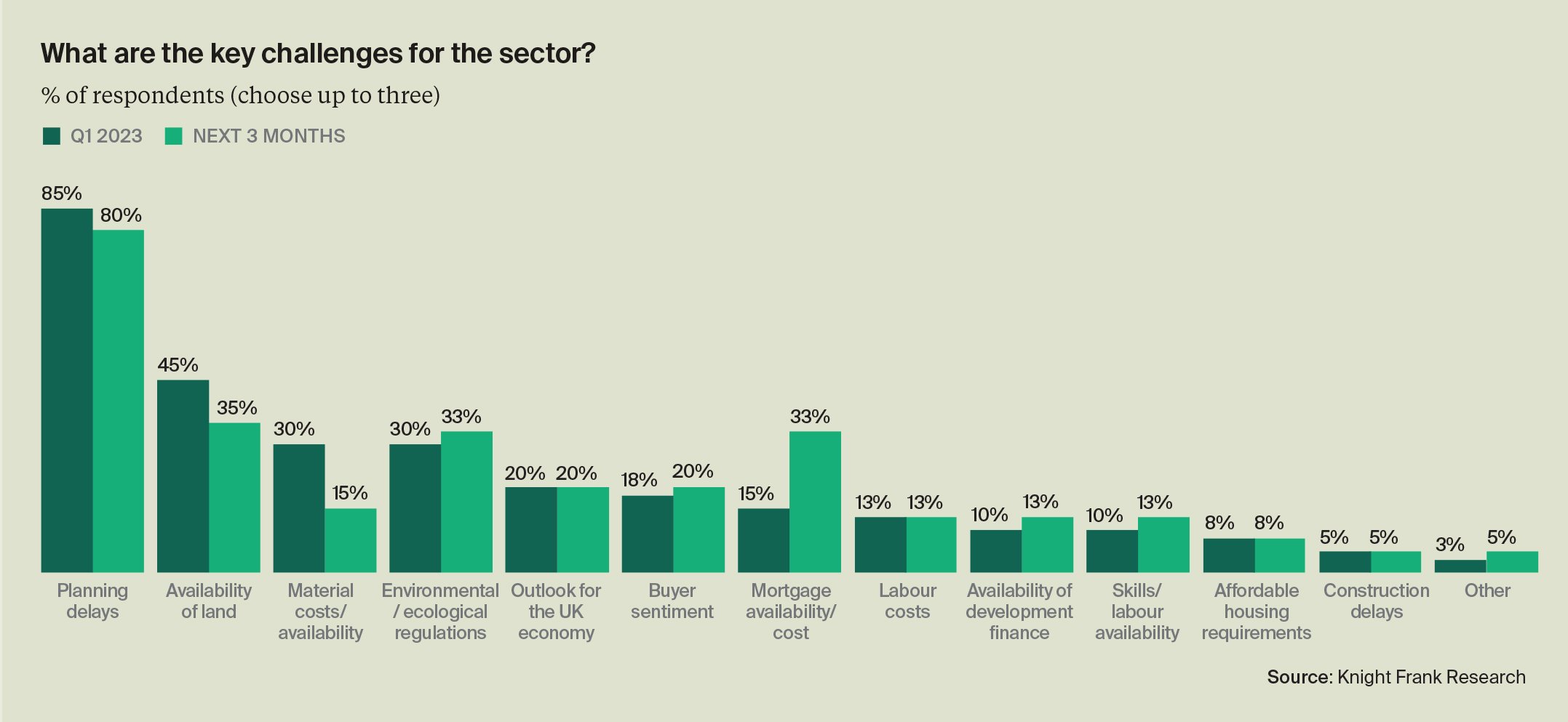 Some 85% of respondents to our Q1 survey of volume and SME housebuilders cited planning delays as the greatest challenge for their business in Q1, up from 73% in Q4.