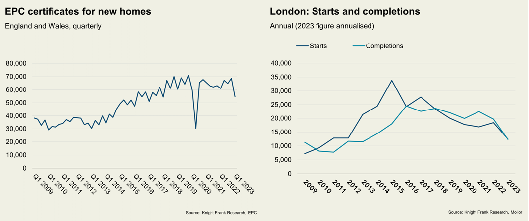 The net result is that the latest supply-side indicators make for dire reading. Energy Performance Certificate (EPC) data suggests just 54,575 new homes were completed in Q1 2023, a 20% decline on the previous quarter. In London, completions were 25% down year-on-year, while new starts dropped 43%, according to Molior. Data from Glenigan points to a 44% fall in starts on site during the three months to the end of April compared with a year ago.