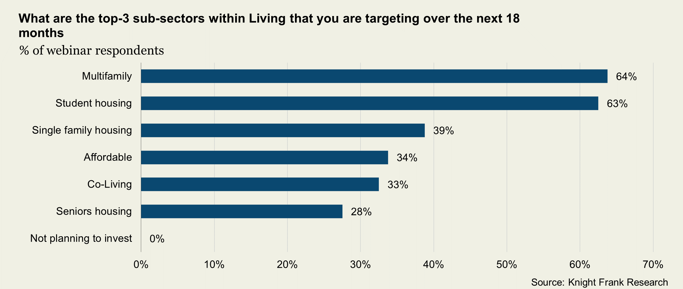 With such an unprecedented pace of change, our latest Active Capital webinar examined the Living Sectors in more detail. We asked attendees which sub-sectors within Living they were targeting over the next 18 months, with Multifamily and Student markets coming out top. You can watch the full webinar on-demand.
