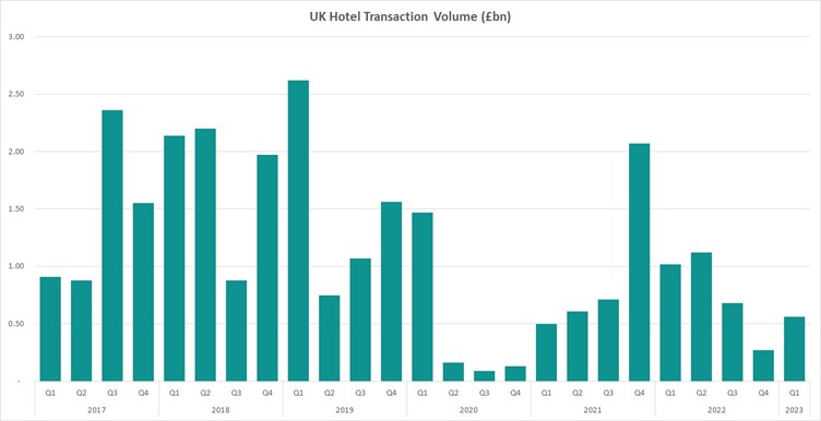UK Hotel transaction volumes reached £0.6 billion for the first quarter of the year.