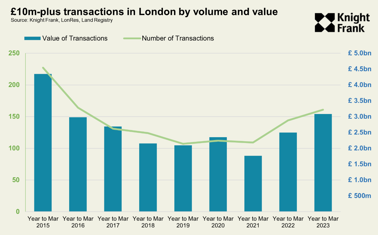 London’s £10 million-plus (super-prime) property market enjoyed a long overdue recovery during the twelve months through March. Buyers spent £3.1 billion on 161 properties, up from £2.5 billion the previous year, making it the strongest year since 2016, according to Knight Frank data released late last week.