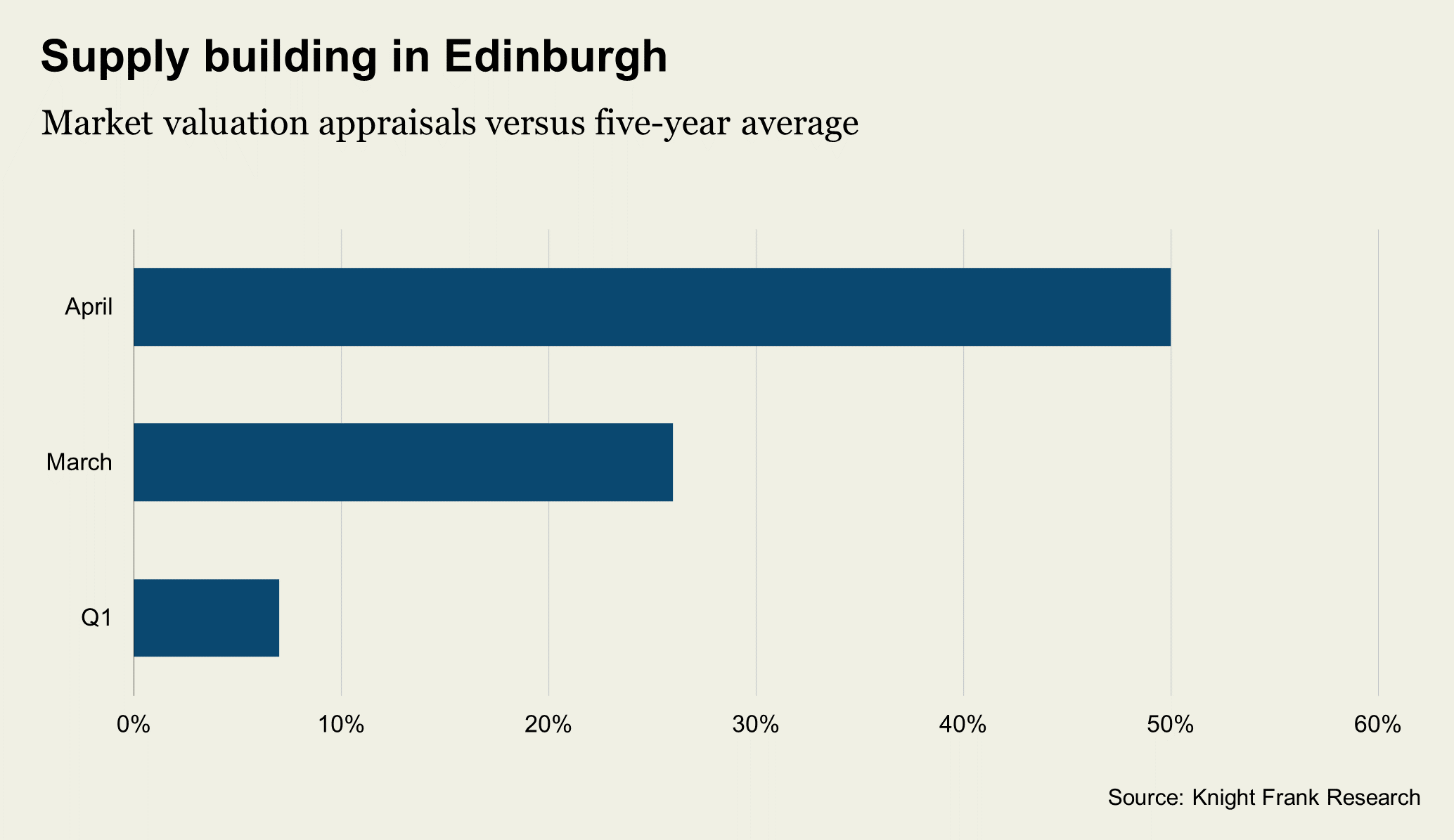 Market valuation appraisals in the Scottish capital were up 50% versus the five-year average in April, compared with an increase of 26% in March (see chart).