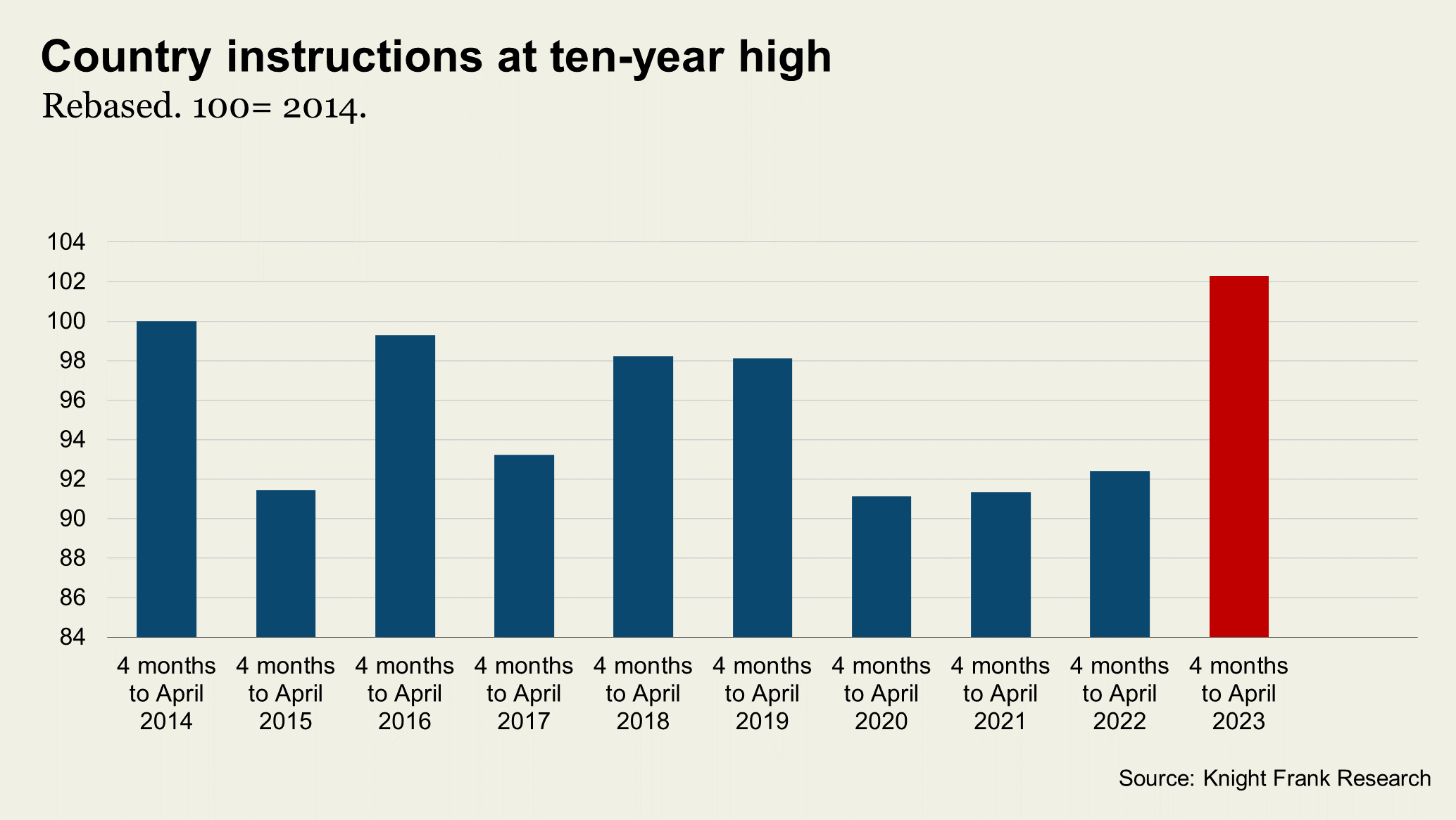 The number of new prospective buyers registering with Knight Frank in the first four months of 2023 outside of London remained the third highest in a decade (behind 2022 and 2021 respectively) and 14% higher than the same period in 2019.