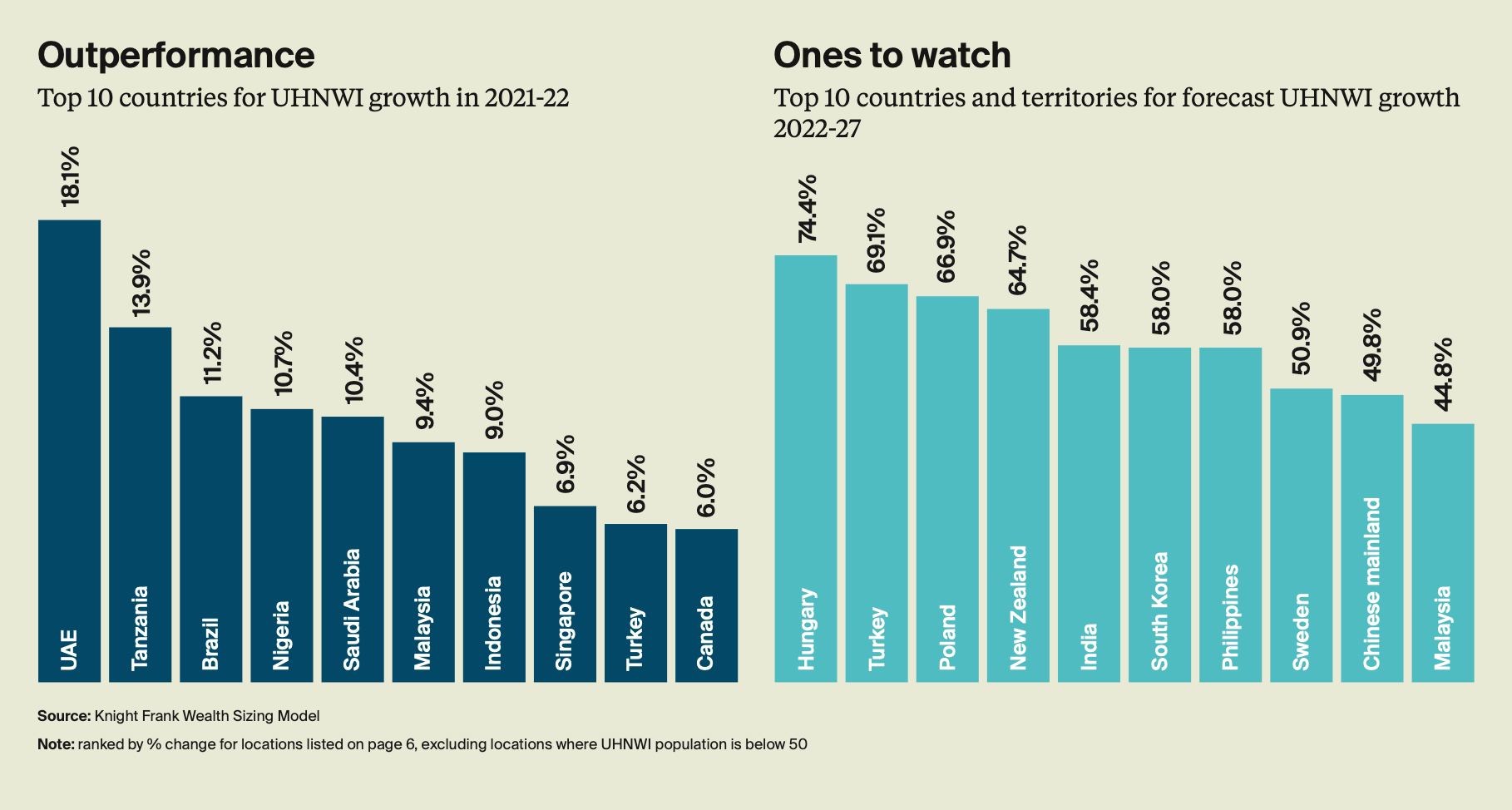 There were nuances to the story - both at a regional and country level, as well as across wealth bands. The Middle East was the standout region, with 16.9% growth in its UHNWI population. The UAE saw growth of 18.1%, making it the fastest growing UHNWI hub (see chart). Africa also proved resilient, with 6.3% growth.