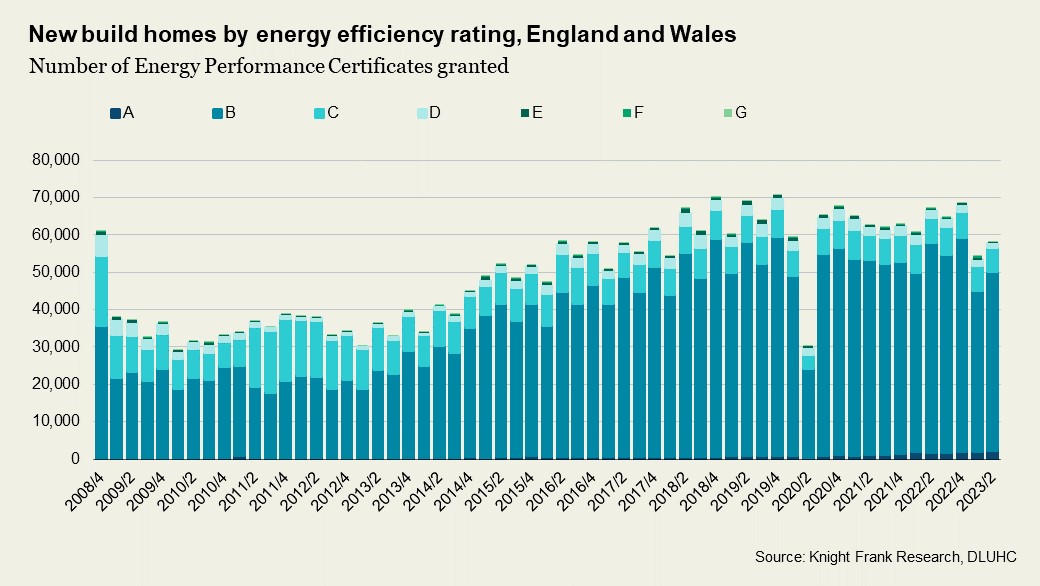 The bulk of new builds have been granted a B rating since records began in 2008, but the proportion of B-rated homes has advanced significantly since then: from around 60% of all stock to 82% in Q2 of this year.