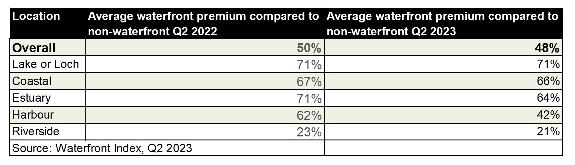 Second was coastal, with an average premium of 66% compared with an equivalent non-waterfront property. In third place –down from joint-first position last year - was estuary, attracting an average premium of 64%.