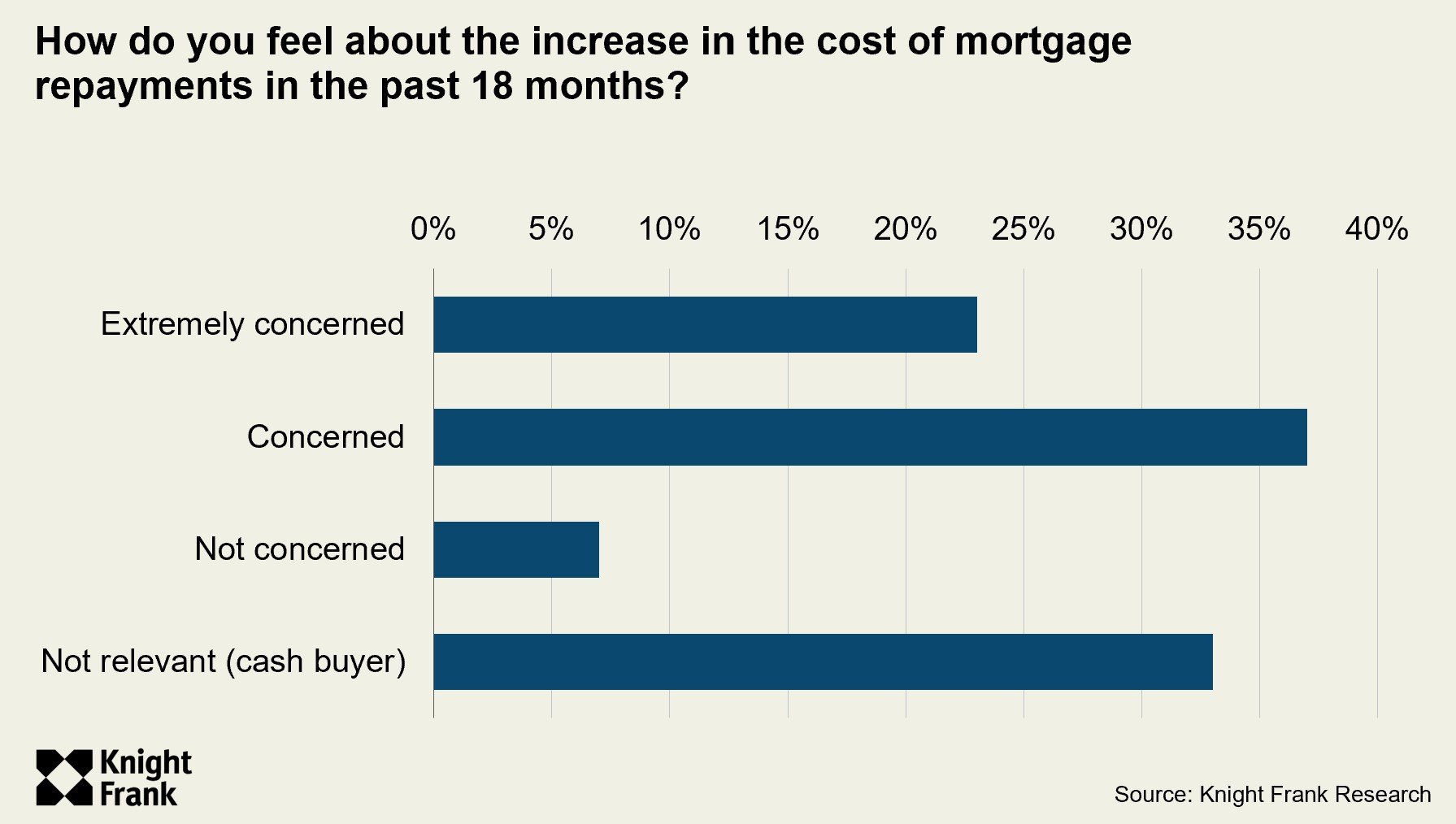 Asked ‘how do you feel about the increase in the cost of mortgage repayments?’ 60% of survey respondents stated it had caused concerned (see chart). Close to a quarter (23%) said they were ‘extremely concerned’.
