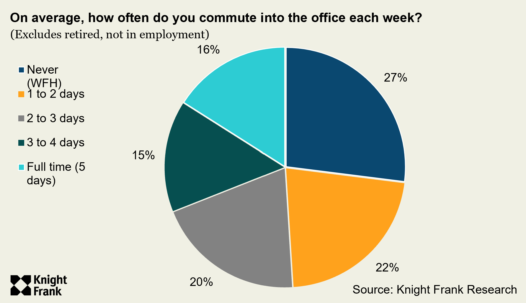 Excluding those that have retired or aren’t in employment, 57% of respondents undertake some form of hybrid working (commuting in between one and four days a week). This is unchanged from last year. With 27% working from home exclusively, just 16% are in the office five days a week.