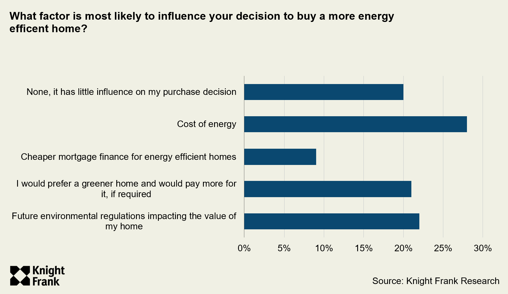 Knight Frank's Residential Property Sentiment Survey is conducted twice a year. It is sent to individuals registered with the business, and is also open to the general public. Topics include sales and purchasing intentions; what the most important factors in a home and location are; and the impact issues such as the cost of borrowing and energy efficiency are having on purchasing decisions.