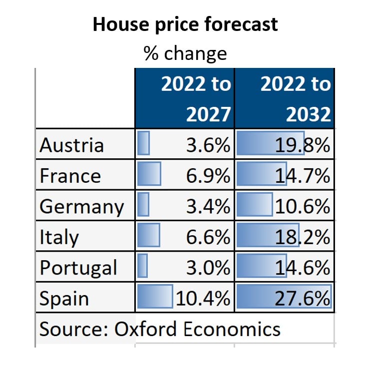 This resilience is also mirrored in the country’s house prices. Average prices across Spain will rise by 10.4% by 2027 and by 27.6% ahead of 2032, outpacing many of its European counterparts, according to OE.